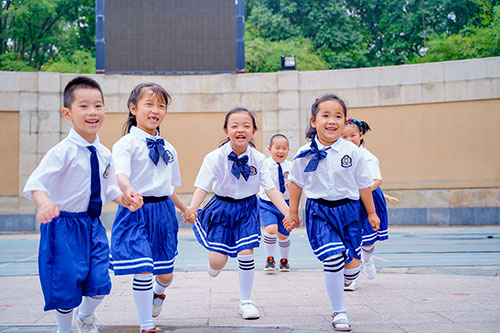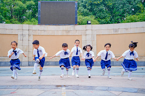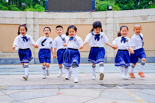 和熟悉的幼稚園,親密的同學牽手留念拍攝